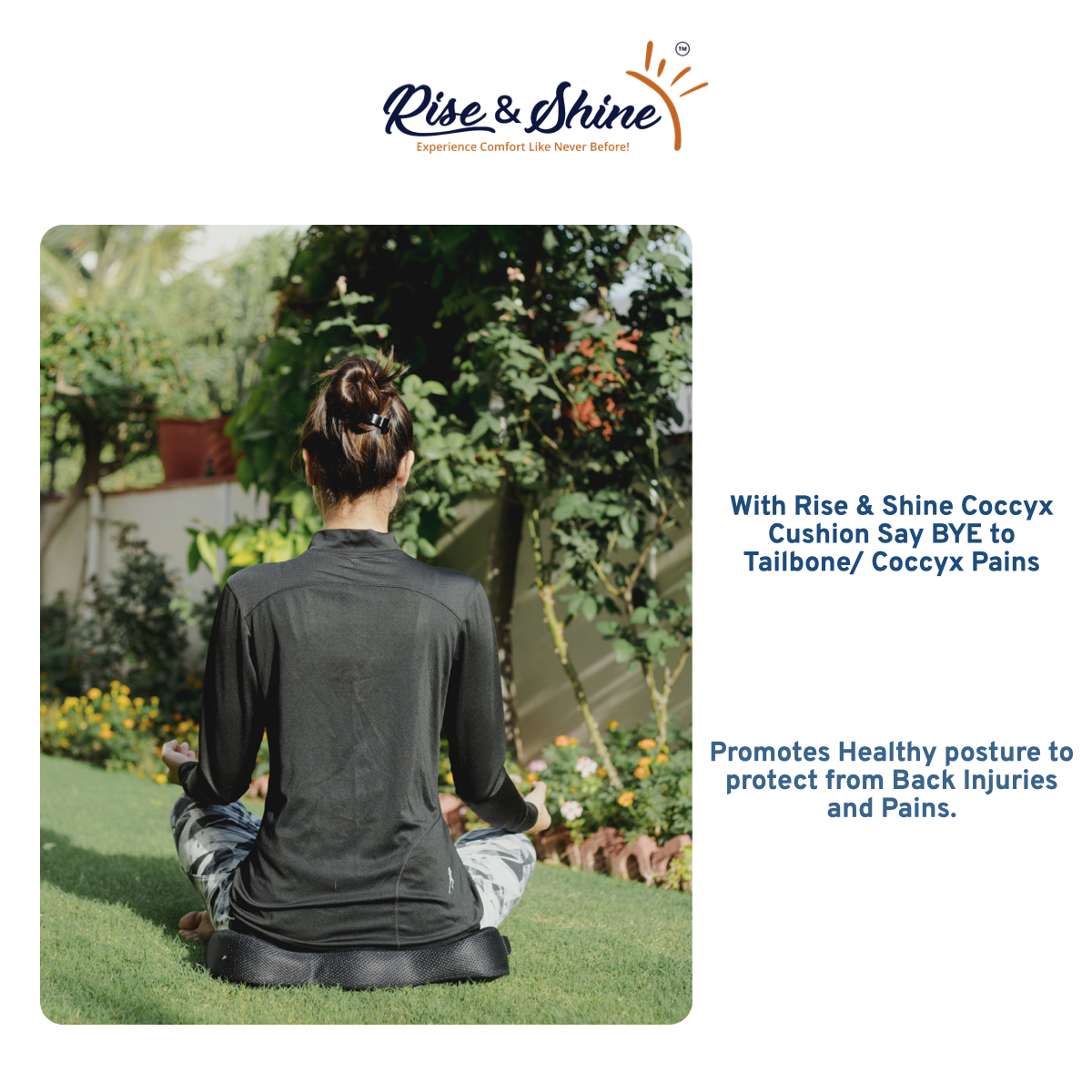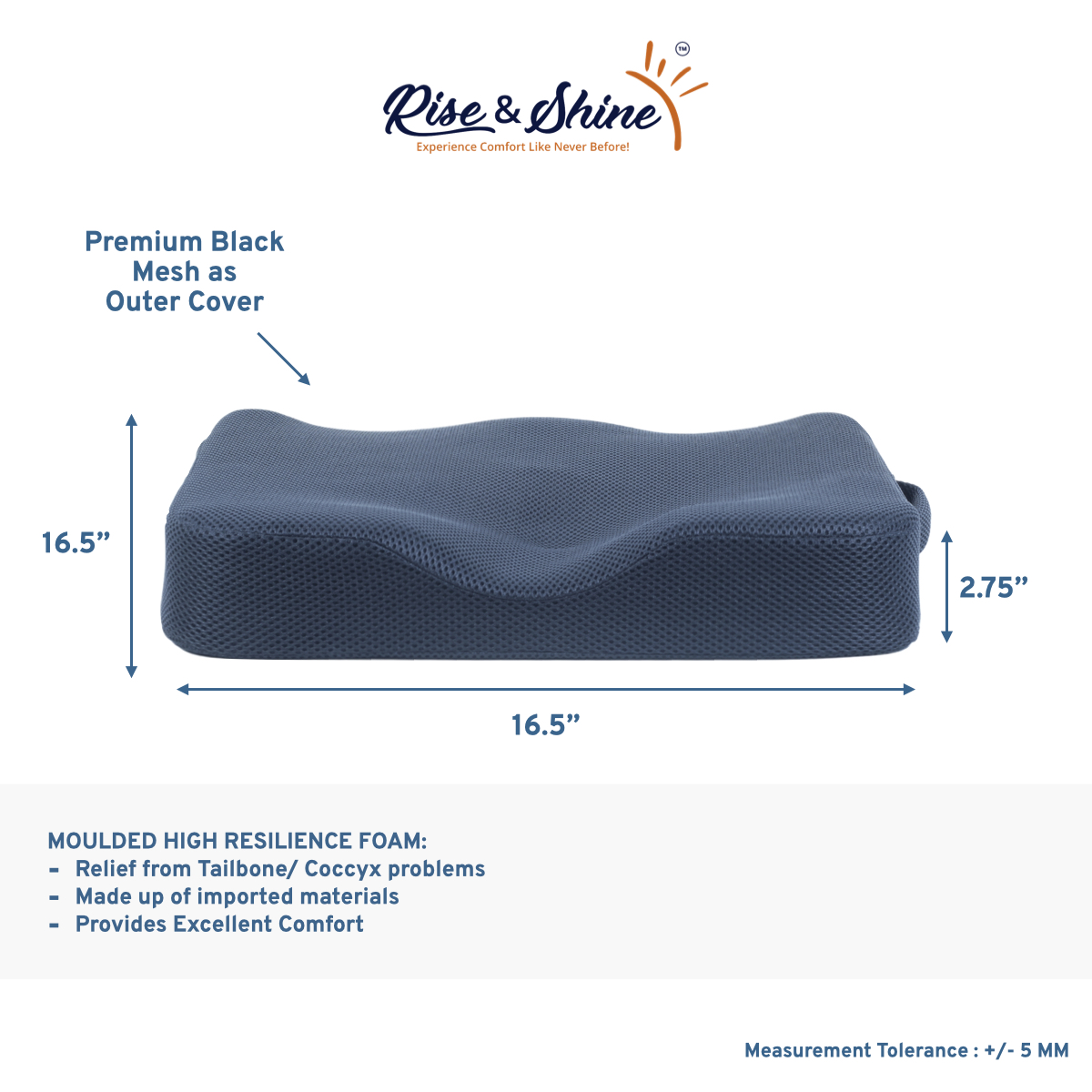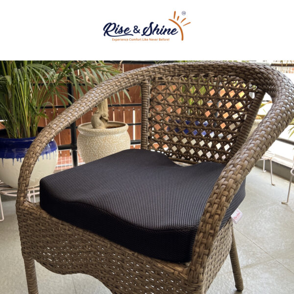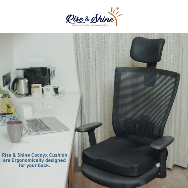 Rise & Shine™ Coccyx Cushion is shaped perfectly to provide your spine and tailbone the right amount of support. With its Ergonomic design and contoured shape this cushion reduces the pressure on the coccyx, Tailbone and Hips while you are sitting, thus relieving pre-existing pain and preventing further pain as well.